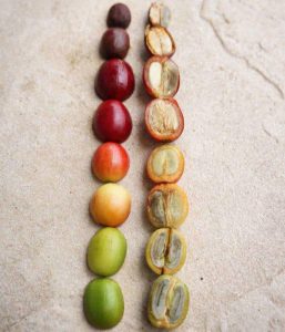 # Arabica: sau khi thu hoạch được lên men , rửa sạch rồi sấy khô. Do vậy vị đặc trưng cảm quân của loại caohe này là họ chua. Vị chua càng thanh thì ly caphe càng ngon. Và vị hậu của caphe sẽ chuyển từ chua thanh sang đắng. Màu sắc đặc trưng của loại caphe này là cánh gián.